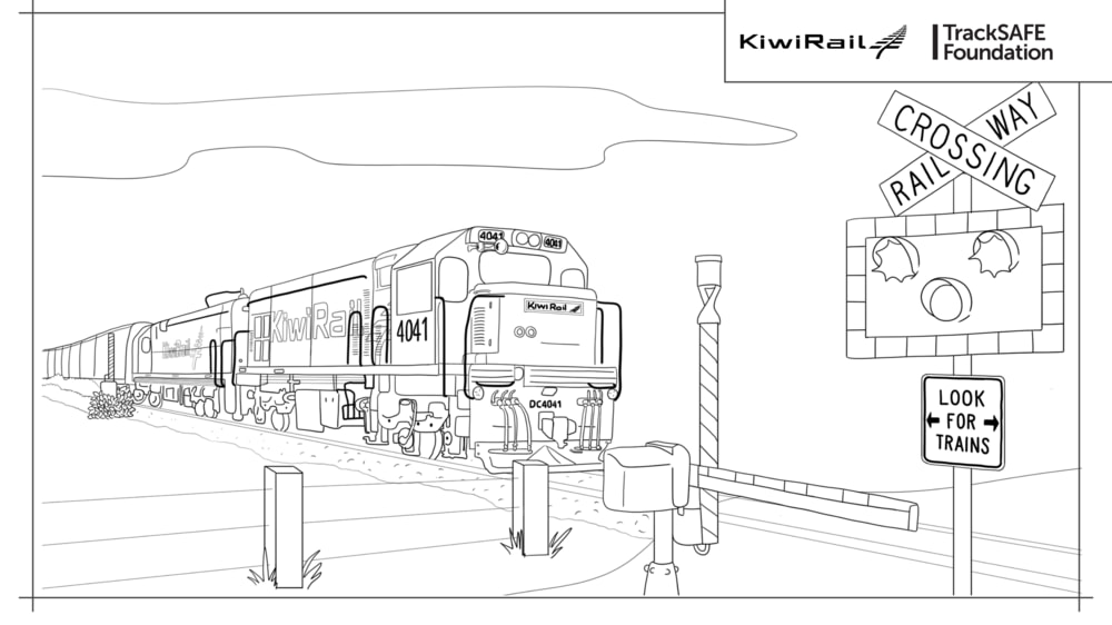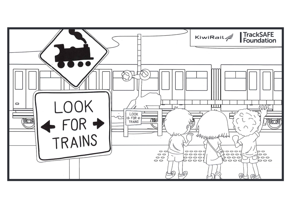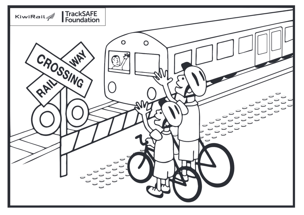 Kids on bikes level crossing colouring in sheet